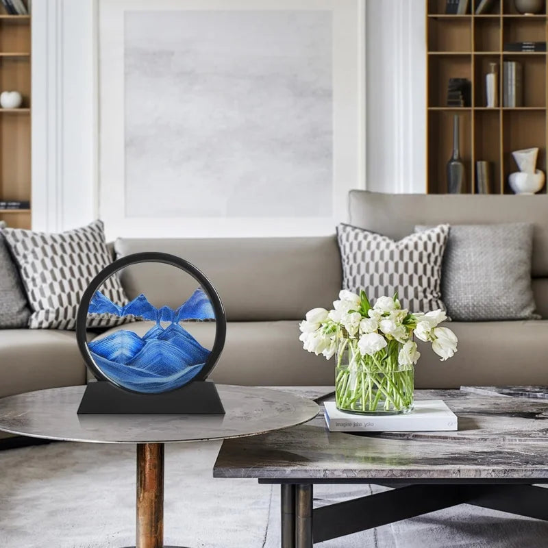 Cet art du sable 3D en sablier crée des paysages de sable en mouvement fascinants qui changent à chaque retournement. Observer le sable former lentement des montagnes et des vallées apporte un effet apaisant et anti-stress.