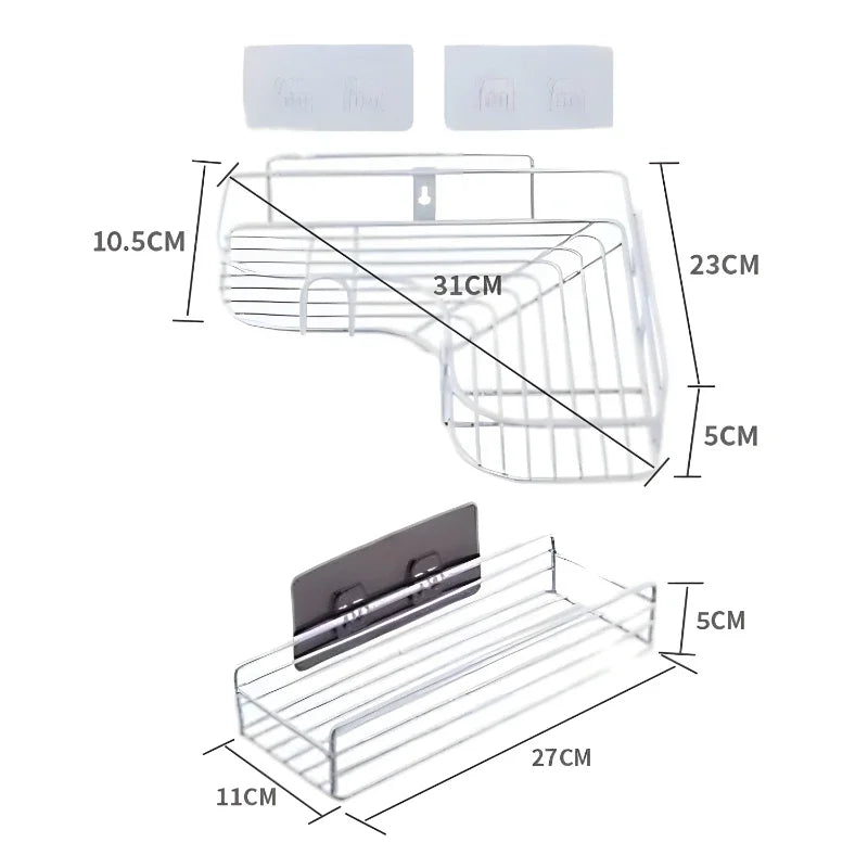 📌 Spécifications : ✅ Matériau : Fer ✅ Dimensions de l’étagère triangulaire : 31 × 23 × 5 cm ✅ Dimensions de l’étagère filaire : 27 × 11 × 5 cm ✅ Installation : Fixation murale sans perçage ✅ Couleurs disponibles : Noir, blanc ✅ Zones d’utilisation : Salle de bain, cuisine, espaces d’angle ✅ Caractéristiques : Gain de place, résistant à la rouille, drainage rapide